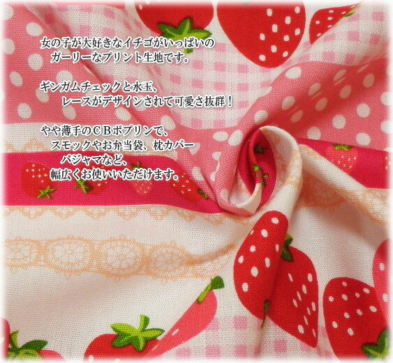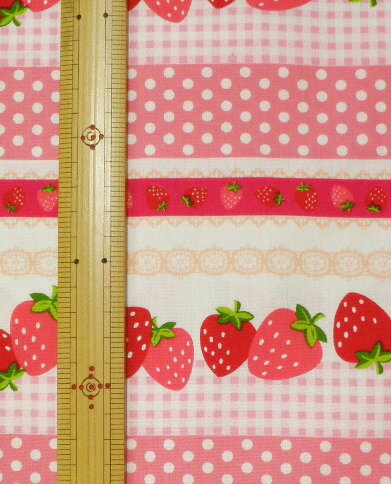 【生地 女の子 布】国産 CBポプリン“ガーリーなストロベリー ボーダー”イチゴ柄(351)【水玉 布】